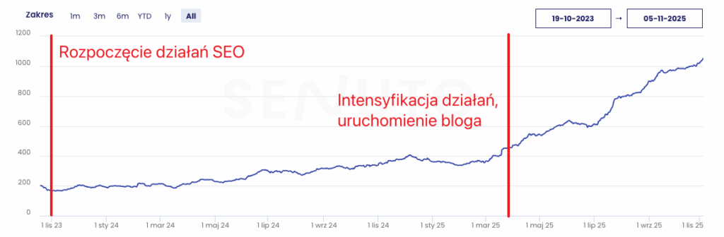 Po rozpoczęciu działań SEO w październiku 2023 roku zauważalny był stopniowy, stabilny wzrost widoczności. Kolejny wyraźny skok nastąpił na przełomie lutego i marca 2025 roku, kiedy zintensyfikowaliśmy prace oraz uruchomiliśmy sekcję blogową, wspierającą frazy informacyjne i długiego ogona.