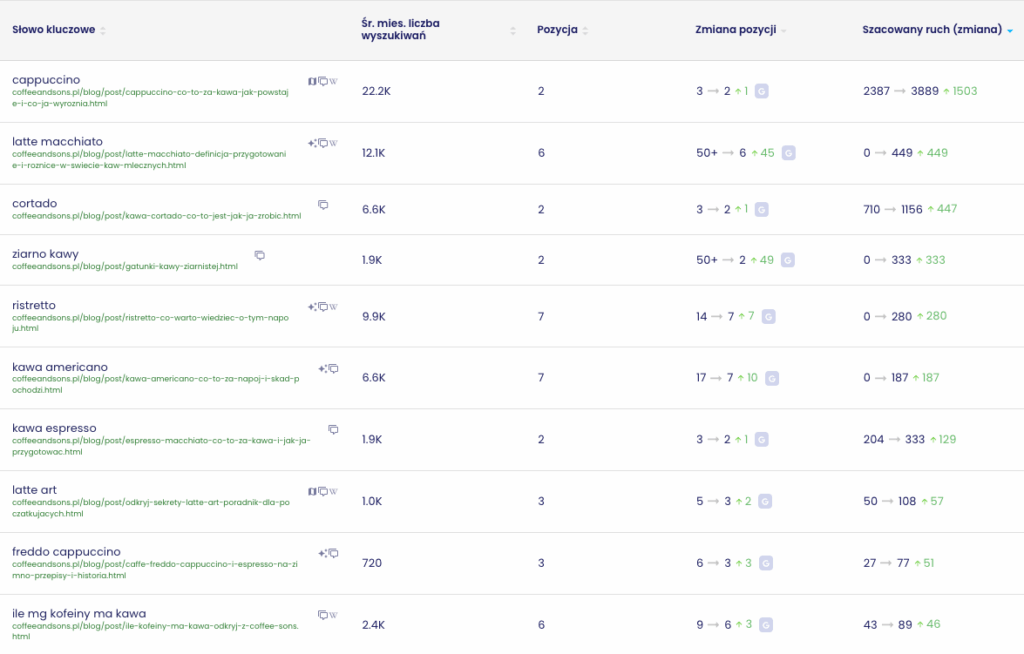 Trend ten potwierdza skuteczność przyjętej strategii: połączenie optymalizacji technicznej, rozbudowy treści kategorii oraz regularnej publikacji wartościowych artykułów znacząco poprawiło pozycję marki Coffee & Sons w wynikach wyszukiwania i wzmocniło jej rozpoznawalność wśród miłośników kawy speciality.